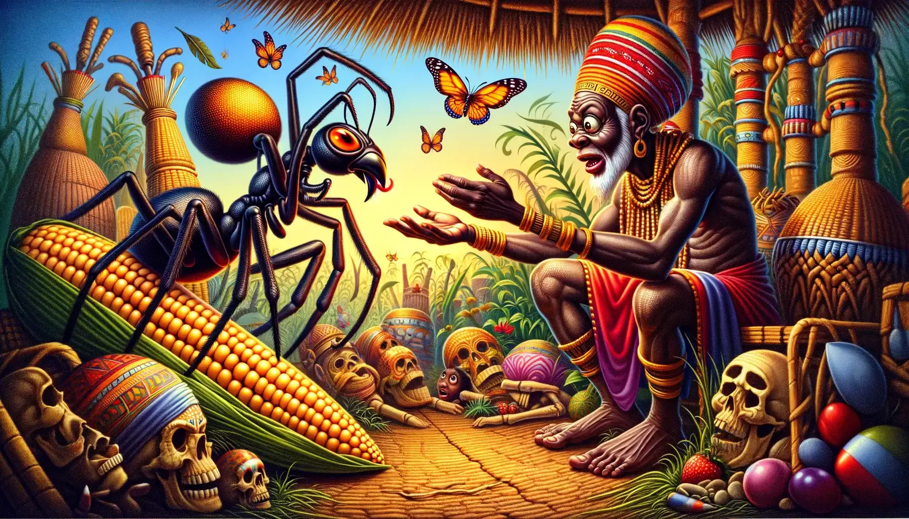 Certo dia, Anansi fez um pedido audacioso a Deus: uma simples espiga de milho, prometendo em troca entregar cem servos. Divertido com a ousadia de Anansi, Deus concedeu-lhe a espiga.