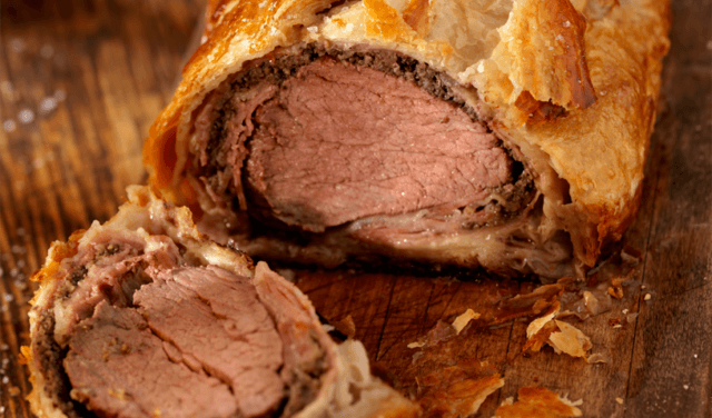 Bife Wellington é um preparado de bife de filé revestido com patê e duxelles, que é então envolvido em massa folhada e assado.