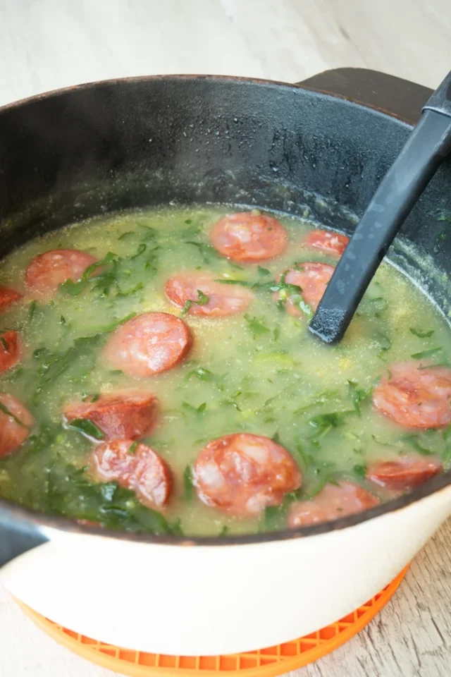 O caldo verde é um dos pratos mais emblemáticos da gastronomia portuguesa, especialmente apreciado nas noites frias e em festas populares. Tradicionalmente preparado com batata, couve-galega cortada em juliana fina e chouriço, esta variação com feijão traz mais riqueza nutricional e textura ao prato, sem perder o sabor reconfortante que todos conhecemos. É uma excelente forma de reinventar a receita clássica e torná-la ainda mais substancial.