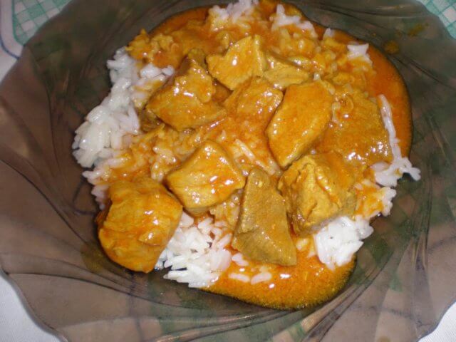 Instruções da receita: Tempere a carne com sal, alho, limão e vinho branco. Refogue a cebola e o alho em azeite, junte a polpa de tomate e adicione a carne e o molho da marinada, tapando e deixando cozinhar brevemente. Numa tigela, misture o leite de coco com o caril e o açafrão; Quando a carne já fervia, junte o leite de coco ao tacho e mexa muito bem. Deixe ferver e cozinhar, mexendo de vez em quando. Leva sensivelmente meia hora a apurar. Sirva o caril de porco com arroz branco ou xima. Nota: Se não tiver leite de coco, junte leite normal e coco ralado, mas não é a mesma coisa. Bom Apetite.
