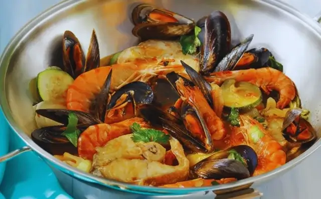 - Distribui os camarões, amêijoas, mexilhões e berbigão por cima do refogado.