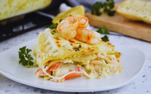 - Repita o processo, alternando camadas de massa, mariscos e molho bechamel, até utilizar todos os ingredientes.