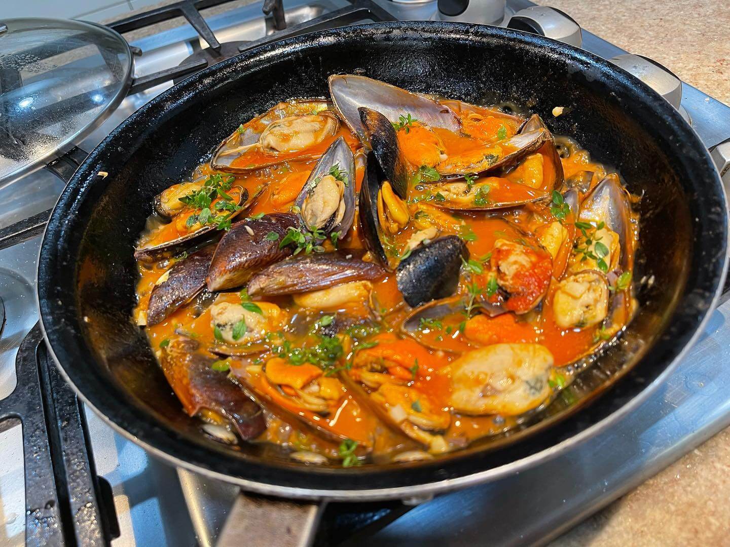 1. Acrescenta os mexilhões à panela e mistura bem para envolver os mexilhões no molho.