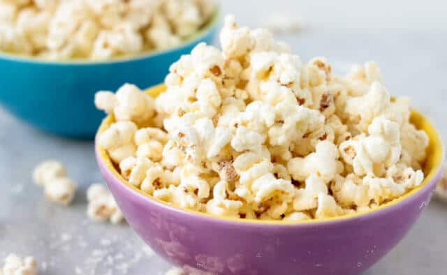 4. Despeje as pipocas em um recipiente e polvilhe o leite em pó.
