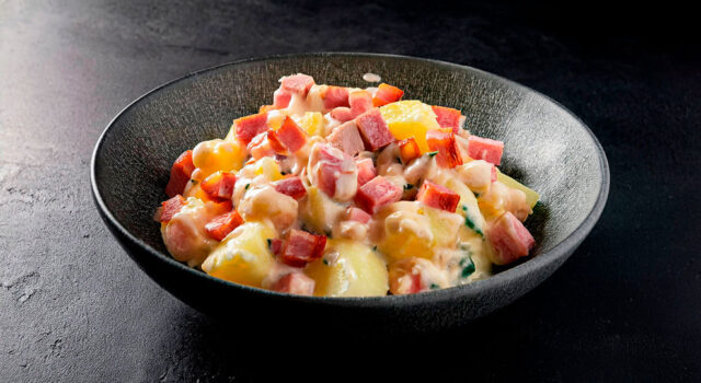 - Envolva delicadamente os ingredientes com o molho preparado, misturando de forma cuidadosa para não desmanchar as batatas.