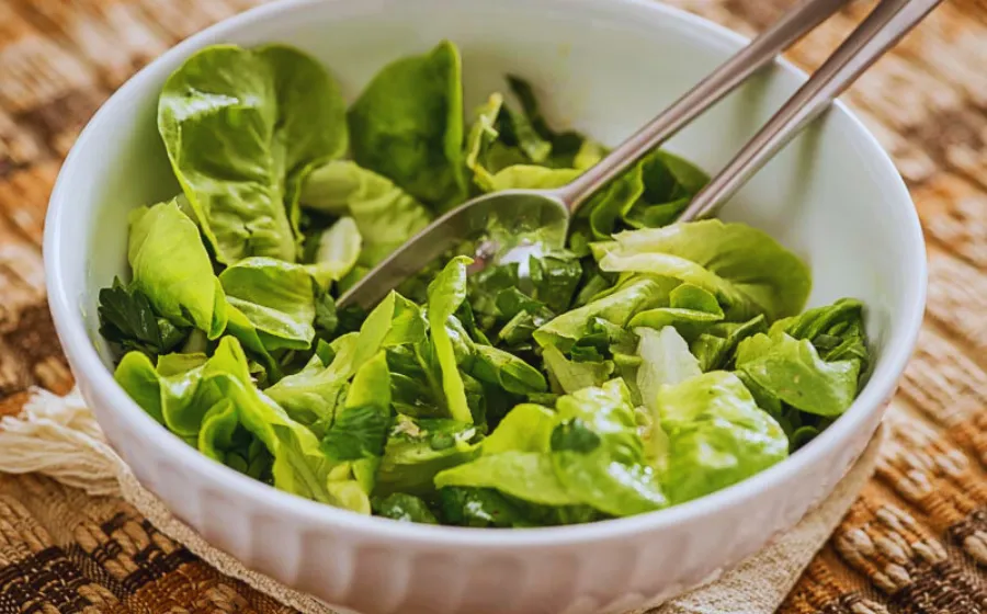 1. Regue a salada com o molho vinagrete preparado, misturando delicadamente para que todas as folhas fiquem temperadas.