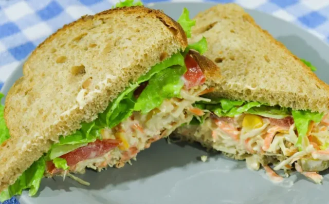 - Montar a Sanduíche: Espalhe uma camada generosa do molho numa fatia de pão. Adicione uma porção da mistura de frango e vegetais. Coloque uma ou duas folhas de alface por cima. Cubra com outra fatia de pão.