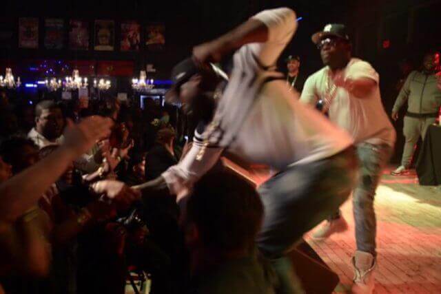 O artista se desequilibra e cai dando um soco contra o peito da mulher. Logo em seguida, o rapper parece que se arrepende do que fez e pede para que os seguranças levem a jovem até o palco. “Diga a ela para subir aqui. Diga a ela para subir aqui”, diz 50 Cent.
